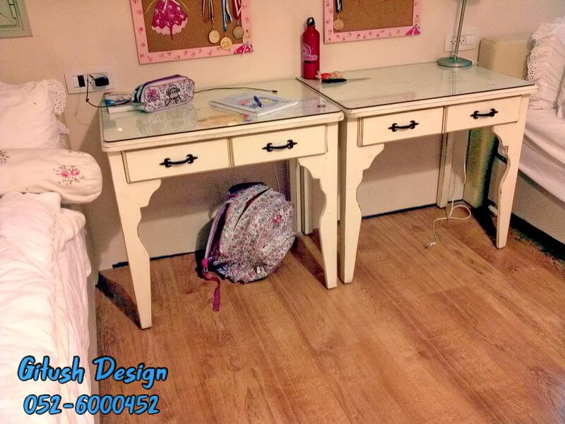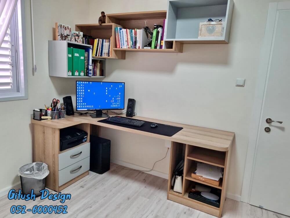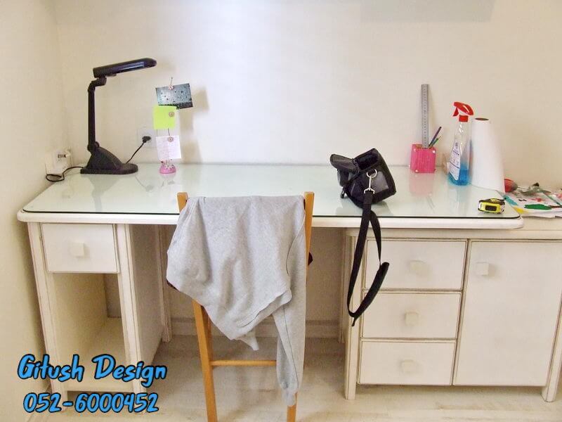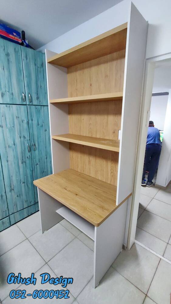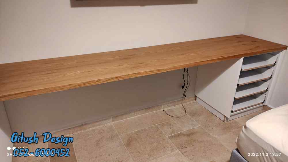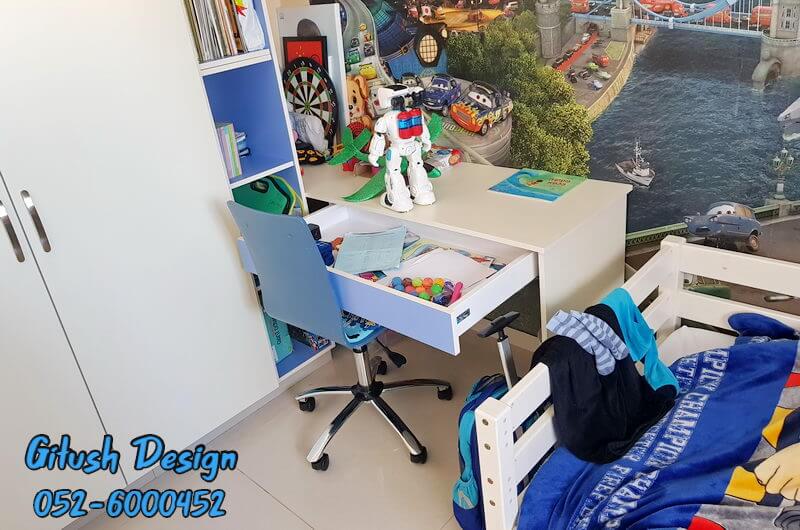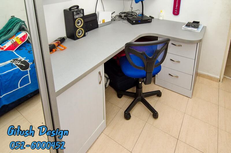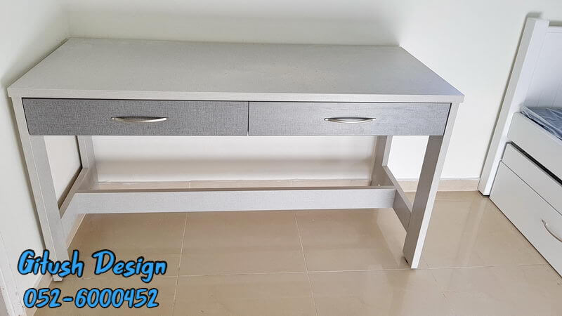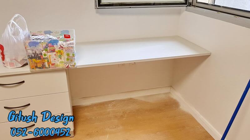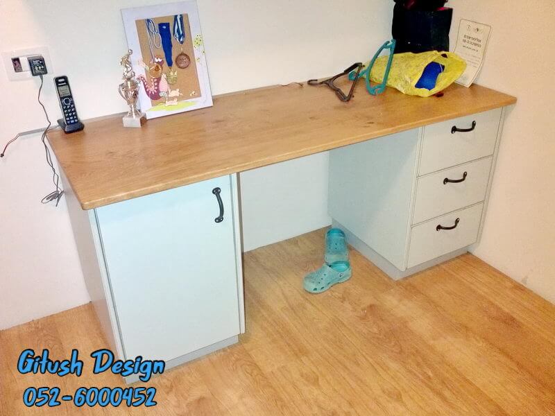 שולחן כתיבה פולימר בהזמנה אישית, עם מקום מרווח לשני ילדים. בנוסף, ארון אחסון ומגירה לכל צד. וכן עם חיזוק פלטה עליונה לקיר למניעת "בטן".