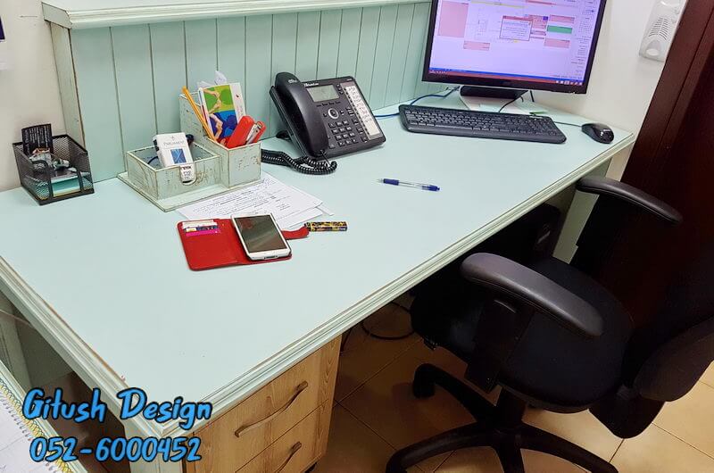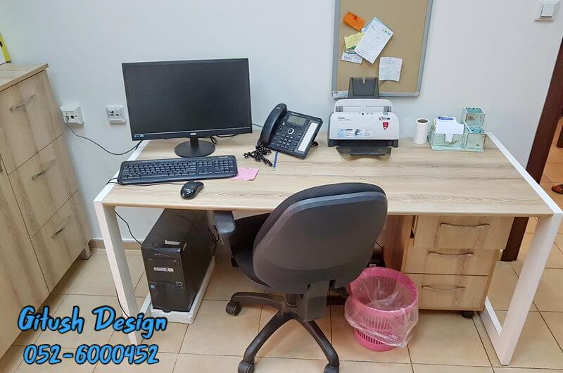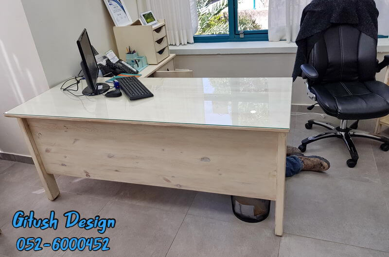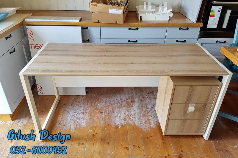 שולחן משרדי בהתאמה אישית, משטח פולימר בגוון אורן מעושן וכן רגליים מעץ בעיצוב מיוחד בצבע לבן.